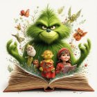 The Grinch and playful green creatures surround a young girl, all immersed in a festive scene with colorful decorations and a large open book, embodying the holiday spirit.