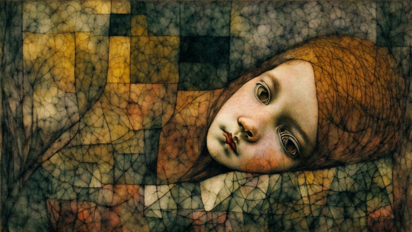 The artwork features a thoughtful young woman with long red hair, resting her chin on her hand. The background consists of muted geometric shapes and colors, enhancing her reflective expression.
