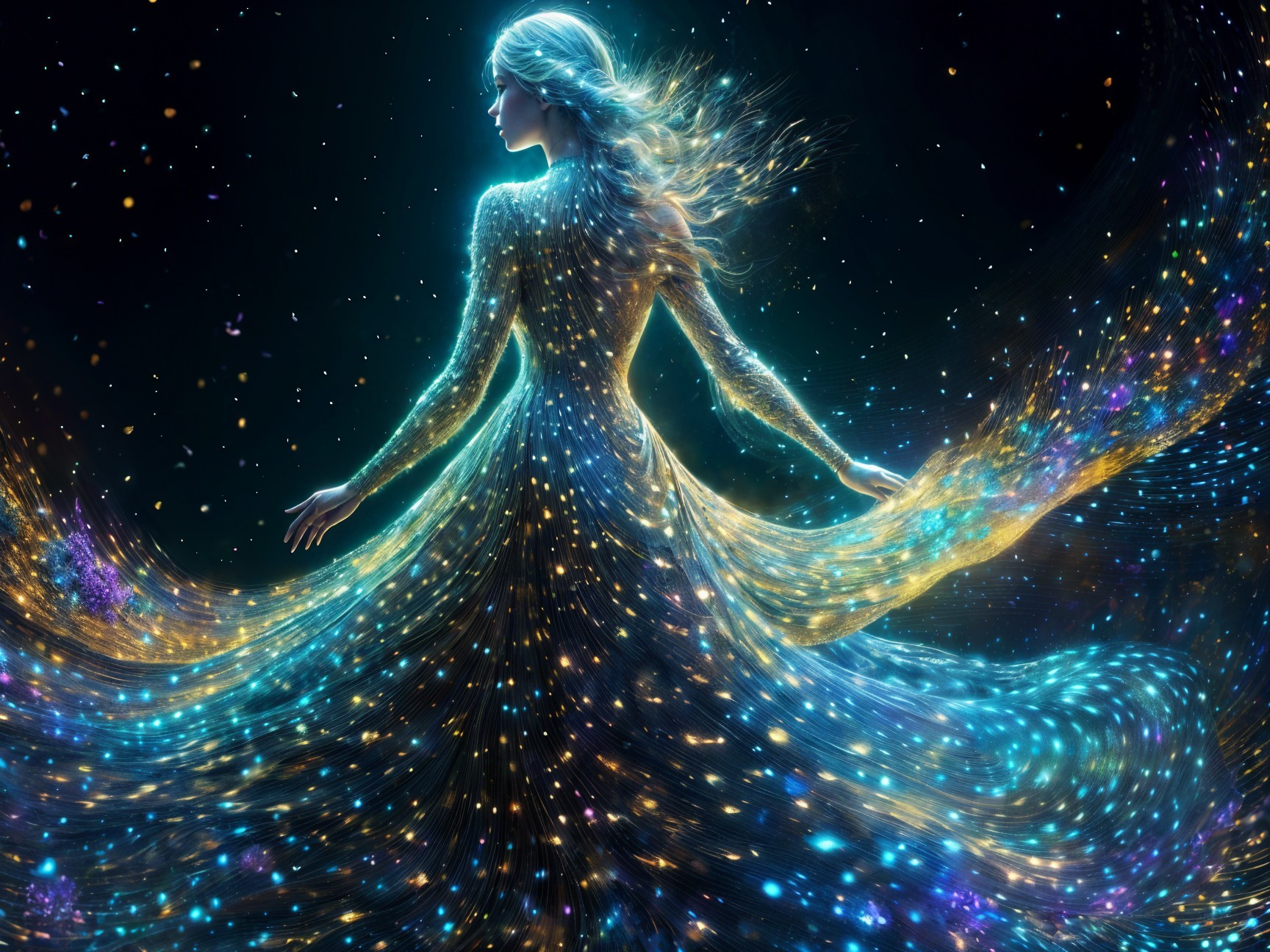 A luminous figure in a flowing gown, surrounded by shimmering lights and swirling patterns, evokes a sense of magic and ethereal beauty against a dark, starry backdrop.