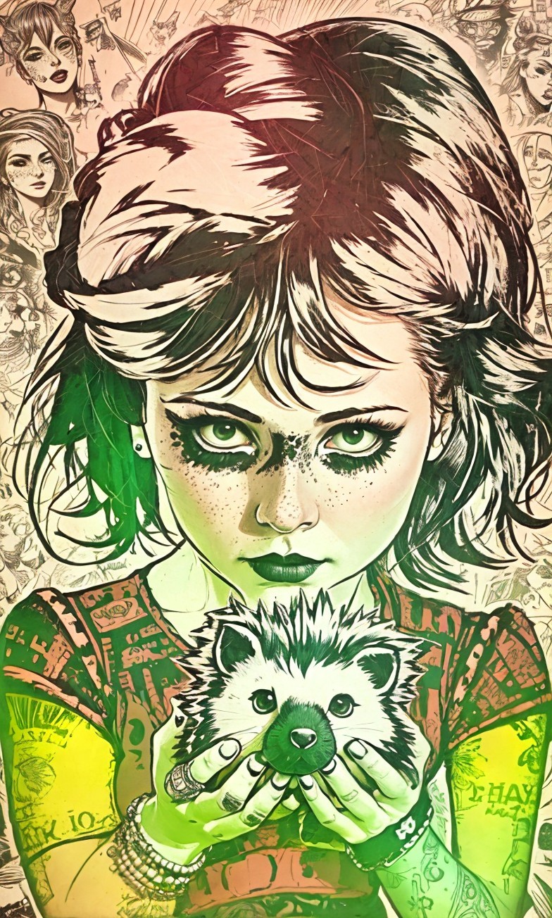 Prompt: Headshot portrait, female punk-rocker, top-to- bottom-view, layered textiles, line drawing, holding a small hedgehog, comical collagraphy by Albert Pinkham Ryder and Ho Baron, stylized by Gerald Brom, pellucid stippled elements, neat, cartoon style, line-art, light-ochre, sea-green. complexion 1.4, dynamic lighting, stylization 1.4, 128k, rigid color scheme, mesmerizingly painted tones, cel-shaded, complexity of colorful gradients, mip mapping, phong shading, dethereal atmosphere, traumacore 1.9, sculpted, flowing hair illusion, ethereal atmosphere blends with turbulent liminal flares. Mysterious collage portrait inspired by Man Ray and Ed Binkley, intricate light composition, delicate tones merging seamlessly, complex color palette featuring light-black, pink, ochre, and green, fluorescent Anglocore in detailed pencil sketch overlay, graffiti art style, ethereal fluidity, enigmatic expression, tall and lean details, dof, debeh, bokeh in indiecore style, multi-perspective, high luminosity, hues in a plique-à-jour technique, stylized background with warm toned fractal effects. Magical realism, merged styles of ho baron and Ed Emshwiller and John buscema, dyed cubist reminiscence by Lyonel Feininger and Catherine Abel, beautiful line-art, intricate indiecore details, slightly angled, zentangle, only curves, stylization 1.8, cracked paper texture, clammy, blotting quill pen linework, visible textures, sticky, angled, sultry, whimsical watercolor and ink. Dynamic and dreamlike composition with layered textures, bold lines, and exaggerated shapes. Visible brushstrokes, soft edges, ethereal light-green glow. Pastel colors transition into a misty baby-blue void adds a touch of magic to the composition, enriched with psychosomatic undertones, expressive hard brush strokes, textured oil on canvas, dynamic paint splashes, drifting paint splatters, multi-dimenstional, stylized, slightly exaggerated features, hues by Ed Binkley, overall composition by Stan Lee and Ignasi Mundo,