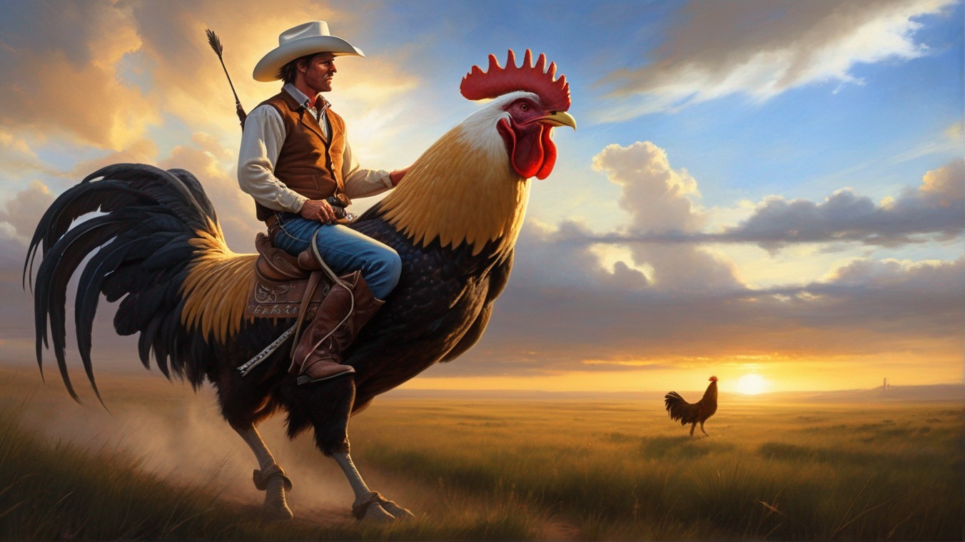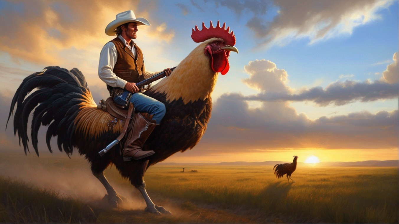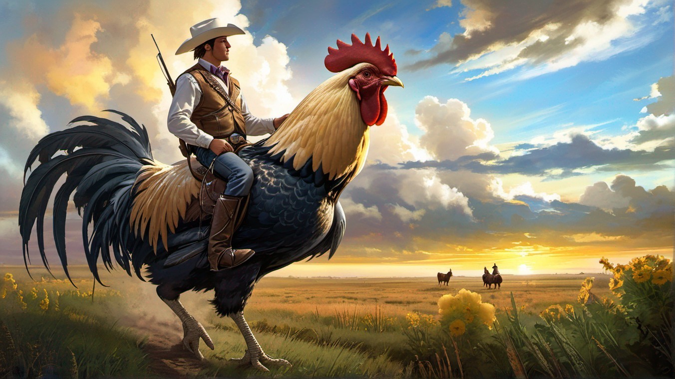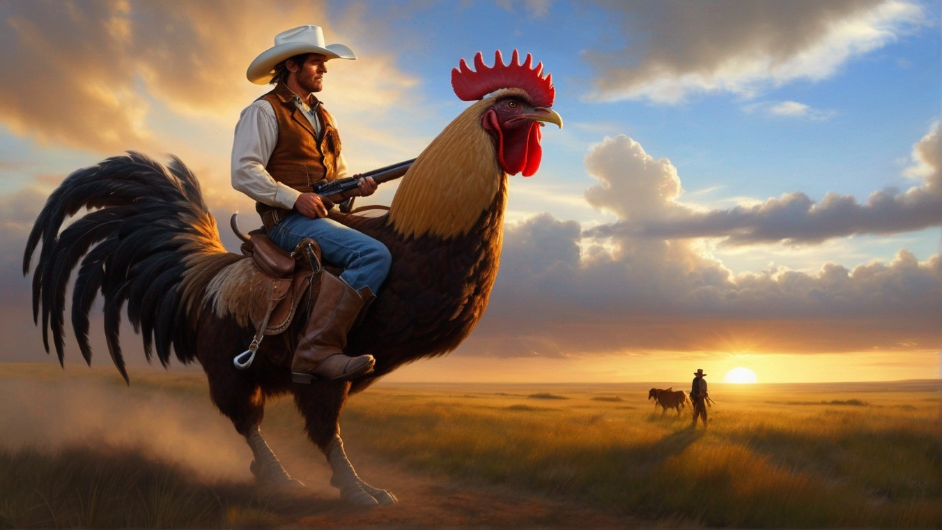 Cowboy Riding Giant Rooster at Sunset on Grassy Plain