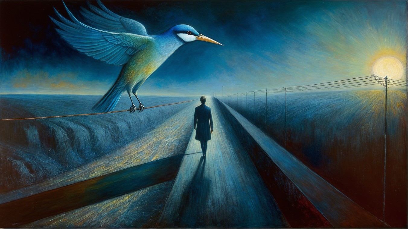 A mysterious woman adorned with a winged headpiece lounges gracefully, draped in soft fabric. A glowing orb and a bird companion add to the surreal, twilight ambiance of the scene.