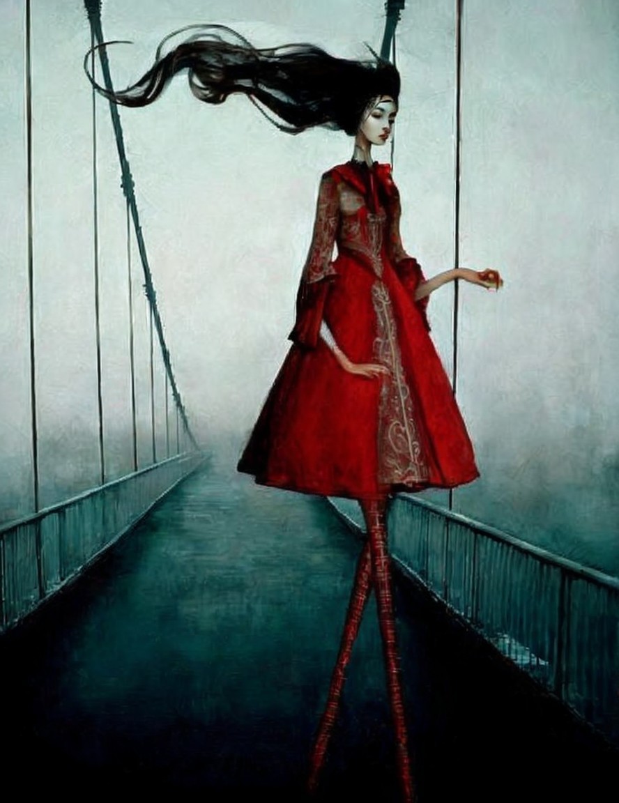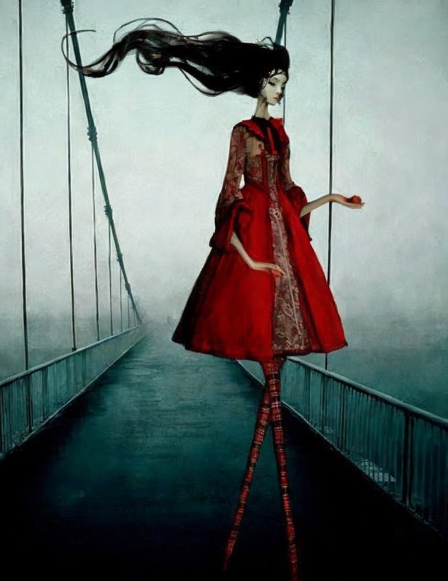 A tall, slender female figure stands in the center of a misty, desolate bridge, shrouded in a somber ambiance. She wears an extravagant, flowing red dress, adorned with intricate patterns and lace, accentuating her elongated shape. Her skin tone is pale, contrasting sharply with the vivid red of her outfit. The dress features puffed sleeves and a high neckline, giving it a regal appearance. her hair is standing straight up