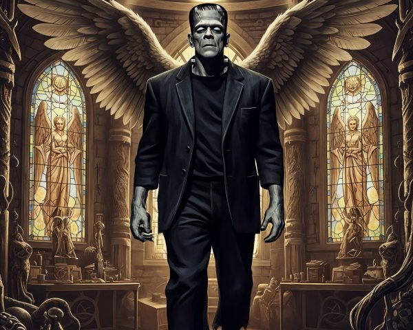 A woman in a blue dress walks along a beach, facing three massive sea serpents emerging from crashing waves, with dramatic clouds overhead, creating a tense and fantastical atmosphere.