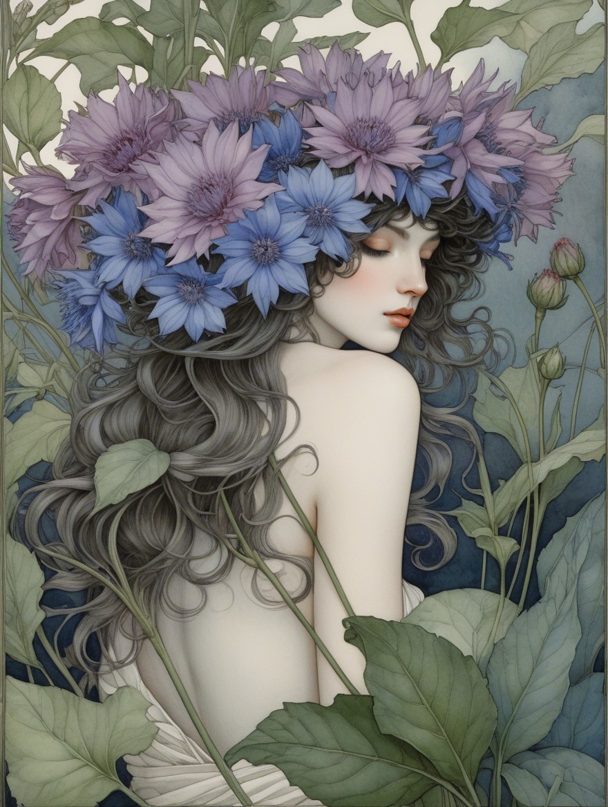 A serene portrait of a woman adorned with a crown of blue and purple flowers, her soft features framed by lush greenery, exuding a sense of tranquility and natural beauty.