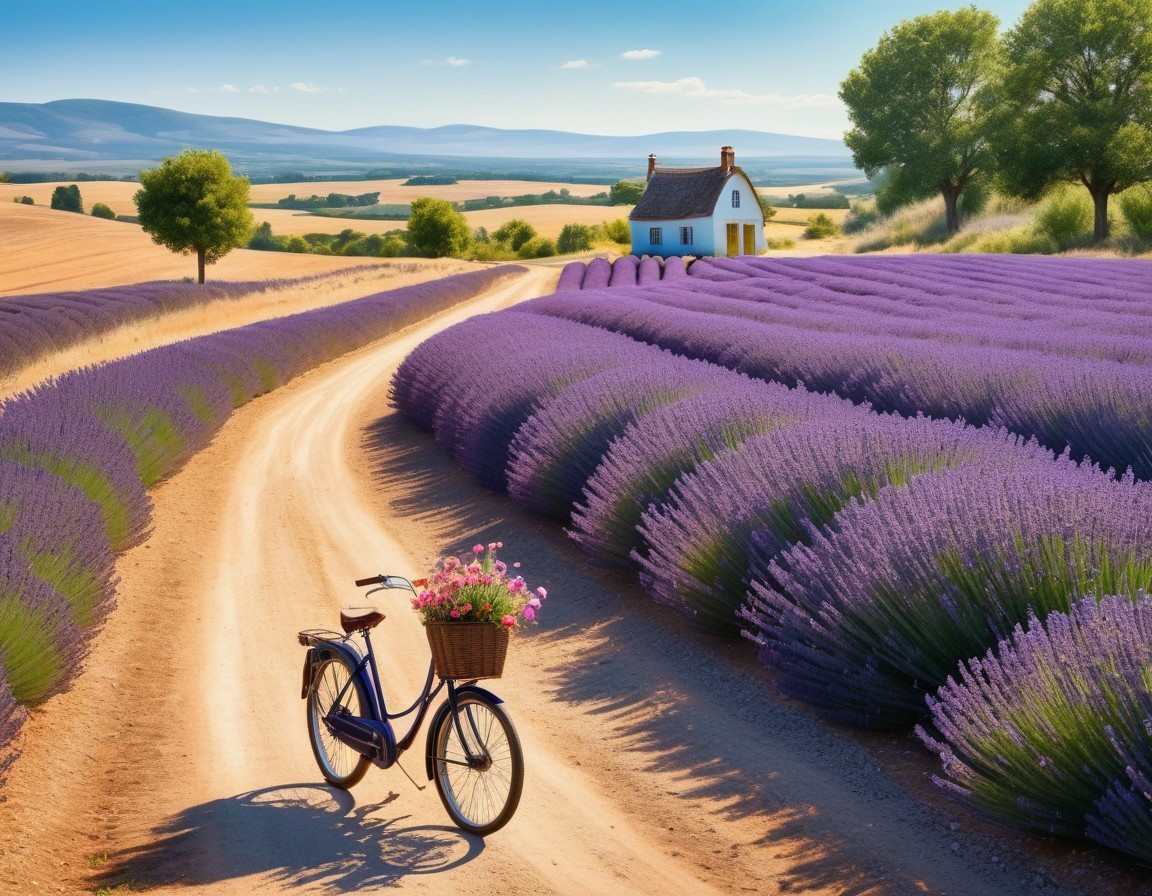 Summer's Journey through the Lavender Fields: Create an image showcasing a narrow, winding road cutting through vast, blooming lavender fields under a clear, vibrant blue sky. The sun is high, casting soft shadows, and a vintage bicycle is leaning against a small wooden sign marking the entrance to the fields. Butterflies flutter around, adding a touch of liveliness to the serene landscape.