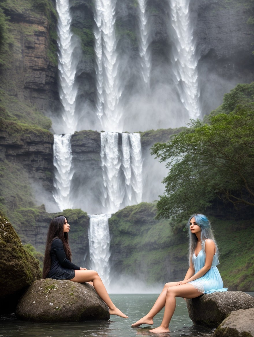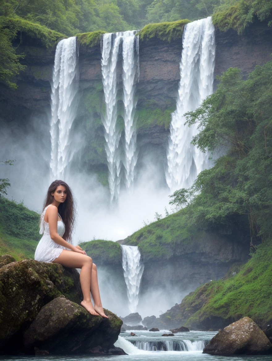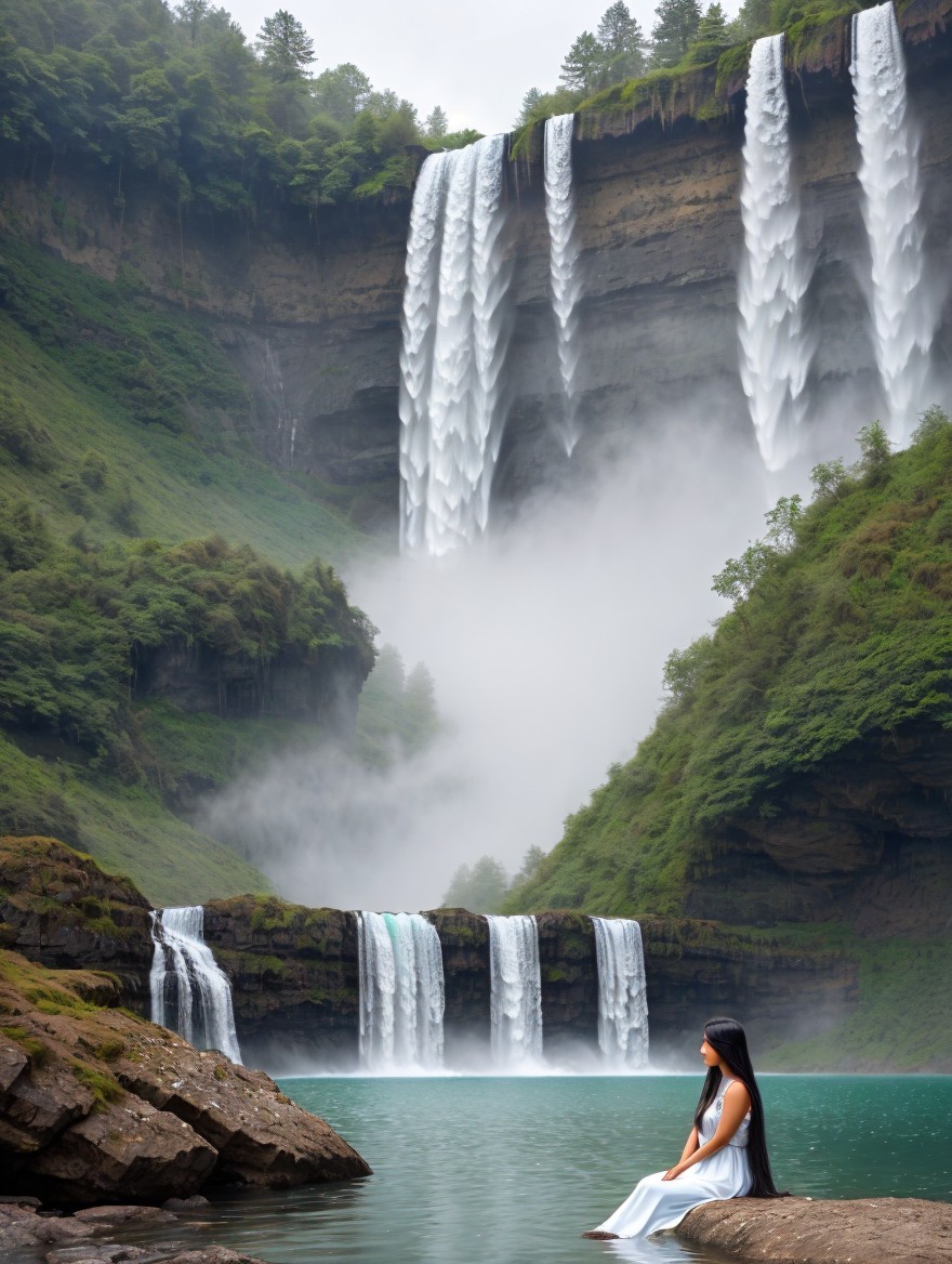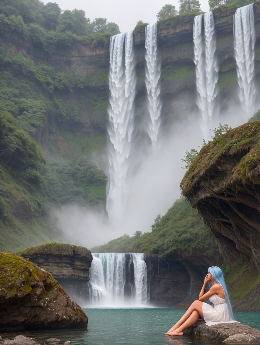+ Prompt:A lady sitting by a foggy lake. She is extremely beautiful with hair that looks by a waterfall. She is nude but her waterfall hair covers her body. She is stunning wing huge dewy blue eyes.