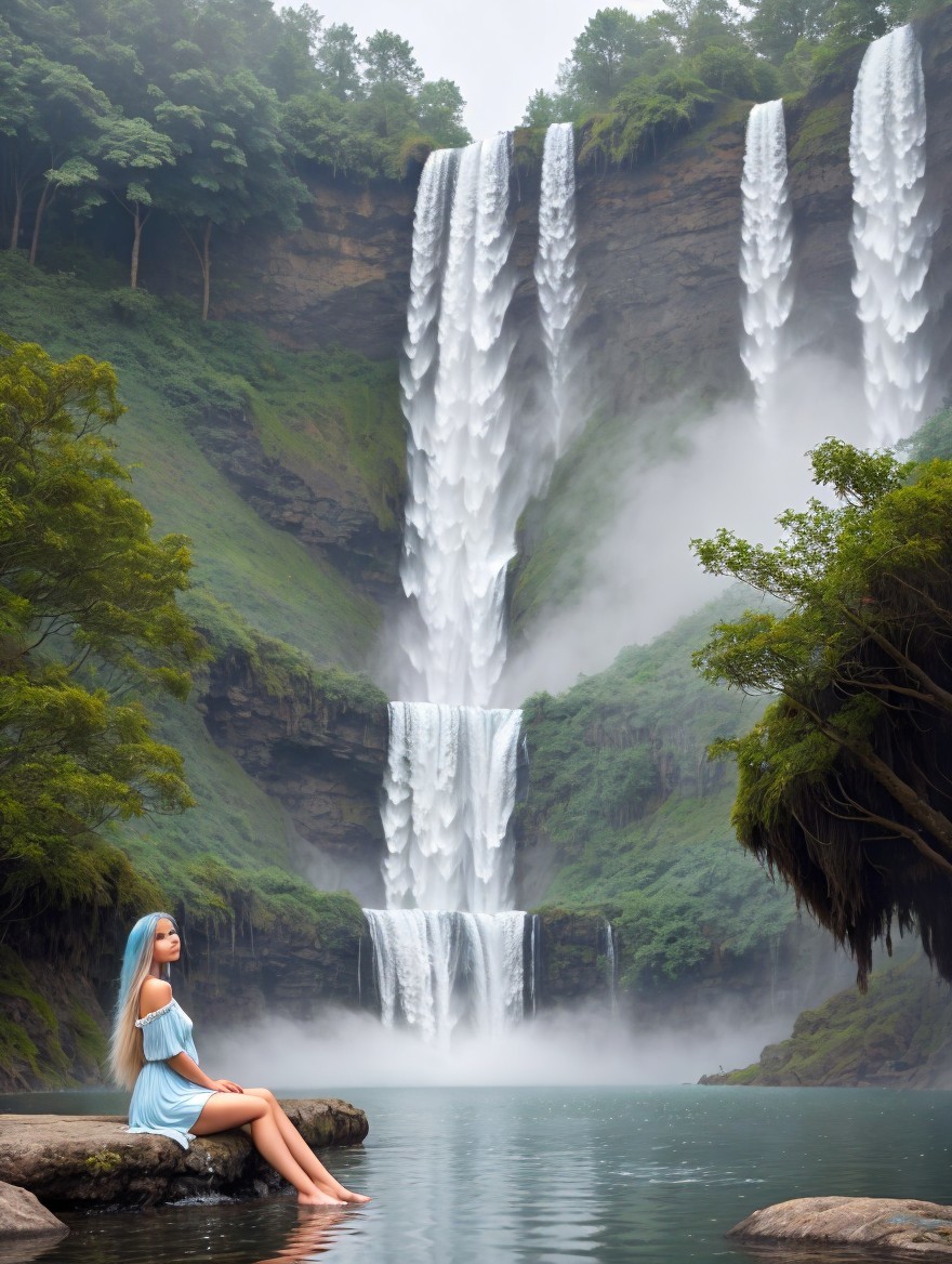 A lady sitting by a foggy lake. She is extremely beautiful with hair that looks by a waterfall. She is nude but her waterfall hair covers her body. She is stunning wing huge dewy blue eyes.