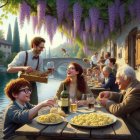 A cheerful scene in a lush, green forest with a woman and six children wearing colorful raincoats, joyfully gathering and sharing chestnuts while a dog watches nearby.
