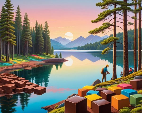 Two girls in colorful dresses stand joyfully together under a starry night sky, with a full moon and cheerful sunflowers surrounding them, while a black dog watches nearby.