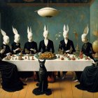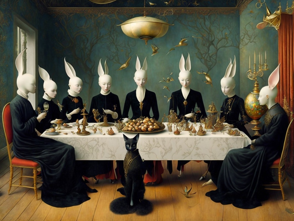 A surreal gathering features figures with rabbit-like ears seated at an ornate table, sharing a feast. A black cat sits at the forefront, enhancing the dreamlike atmosphere of the scene.