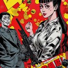 A stylized, paper-cut design features a man in a coat holding a gun and a woman in a casual outfit, both standing against a backdrop of orange trees and a warm landscape.