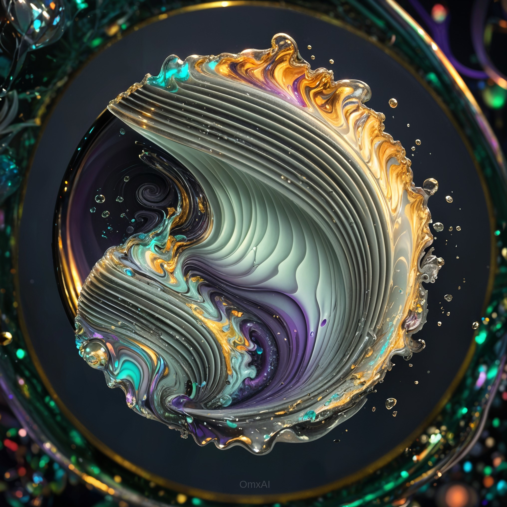 An intricate 3D render of a swirling, colorful liquid forming an abstract, shell-like pattern with iridescent highlights.