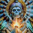 A striking figure adorned with vibrant feathers and elaborate jewelry, featuring a skull-painted face. They stand amidst ancient stone structures, conveying a powerful and mystical presence.