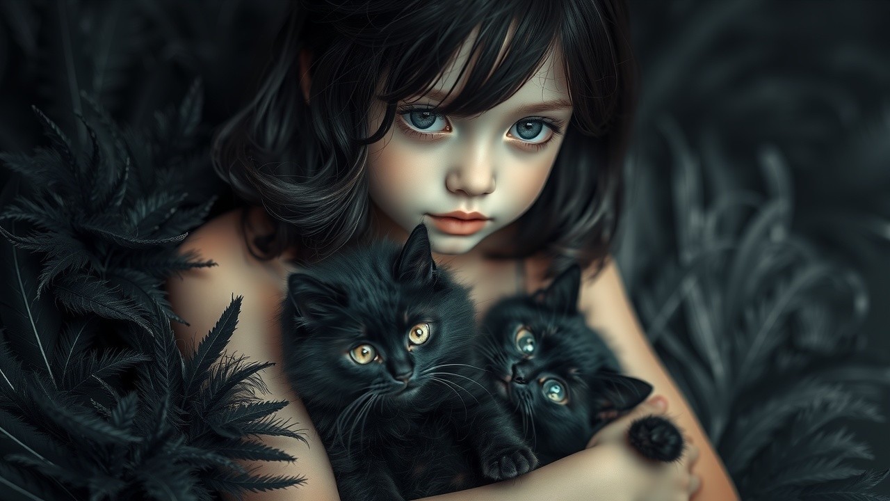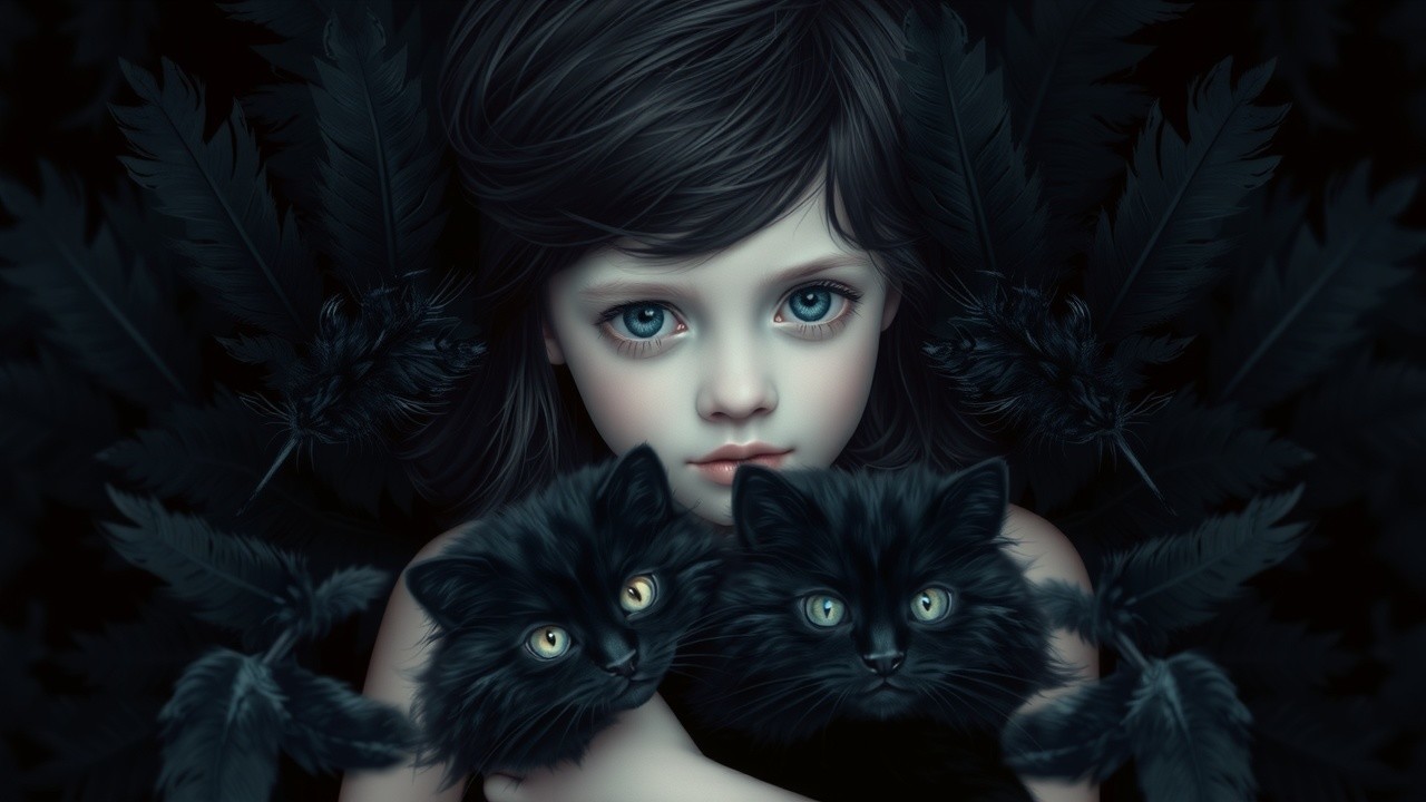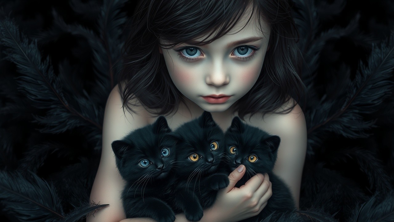 A young girl with pale skin and delicate features sits surrounded by dark, textured feathers. Her wavy black hair frames her face, while her pale blue eyes express introspection. She cradles two fluffy black cats, creating a moody, enchanting scene with soft lighting that highlights her ethereal glow.