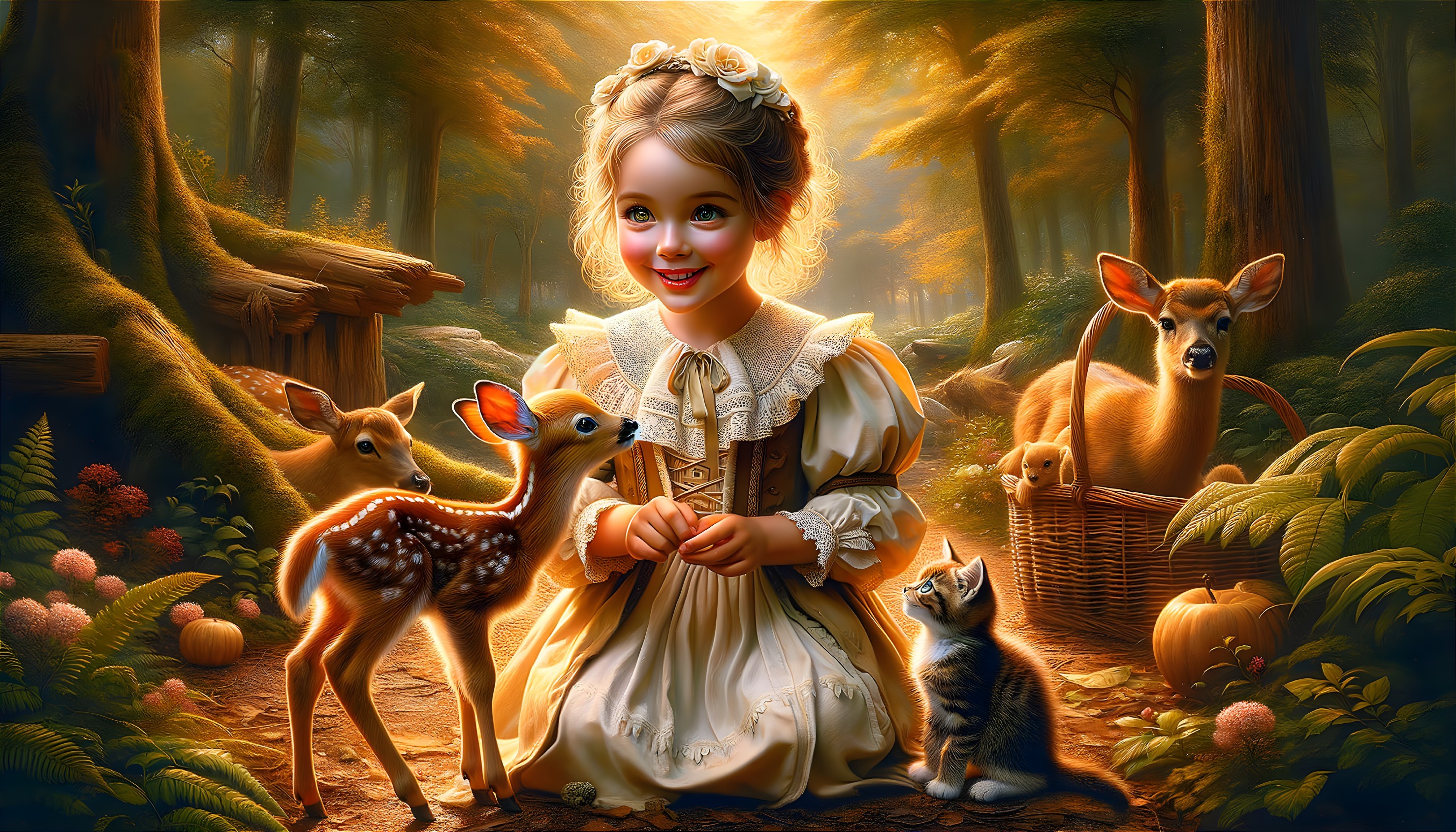 A detailed, enchanting painting captures a young Victorian girl in elegant attire petting a fawn in a picturesque forest. The scene radiates innocence, wonder, and charm, with intricate details and warm lighting enhancing the nostalgic atmosphere.