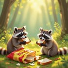Two adorable raccoons sit in a sunlit forest, happily munching on bread from an open snack bag. The scene is serene, surrounded by lush greenery and dappled sunlight filtering through the trees.