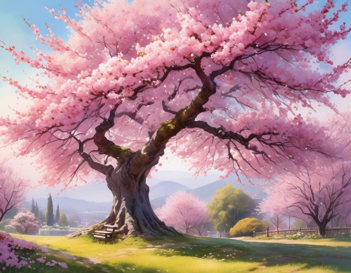 A splendid tree rises with grace in this painting, its strong branches reaching out like inviting arms, decorated with cherry flowers of a gentle and airy pink. Each petal is a quiet poem that sways with the wind. The scenery around the tree is filled with a magical calmness; faraway hills glimpse timidly behind the morning fog, and the green grass spreads endlessly, sprinkled with wildflowers that come alive at sunrise.