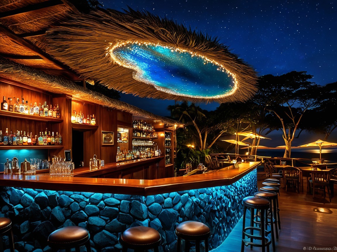 A tropical bar features a wooden countertop illuminated by soft blue lights and a starry sky ceiling, surrounded by shelves of liquor and cozy seating, creating a serene nighttime ambiance.