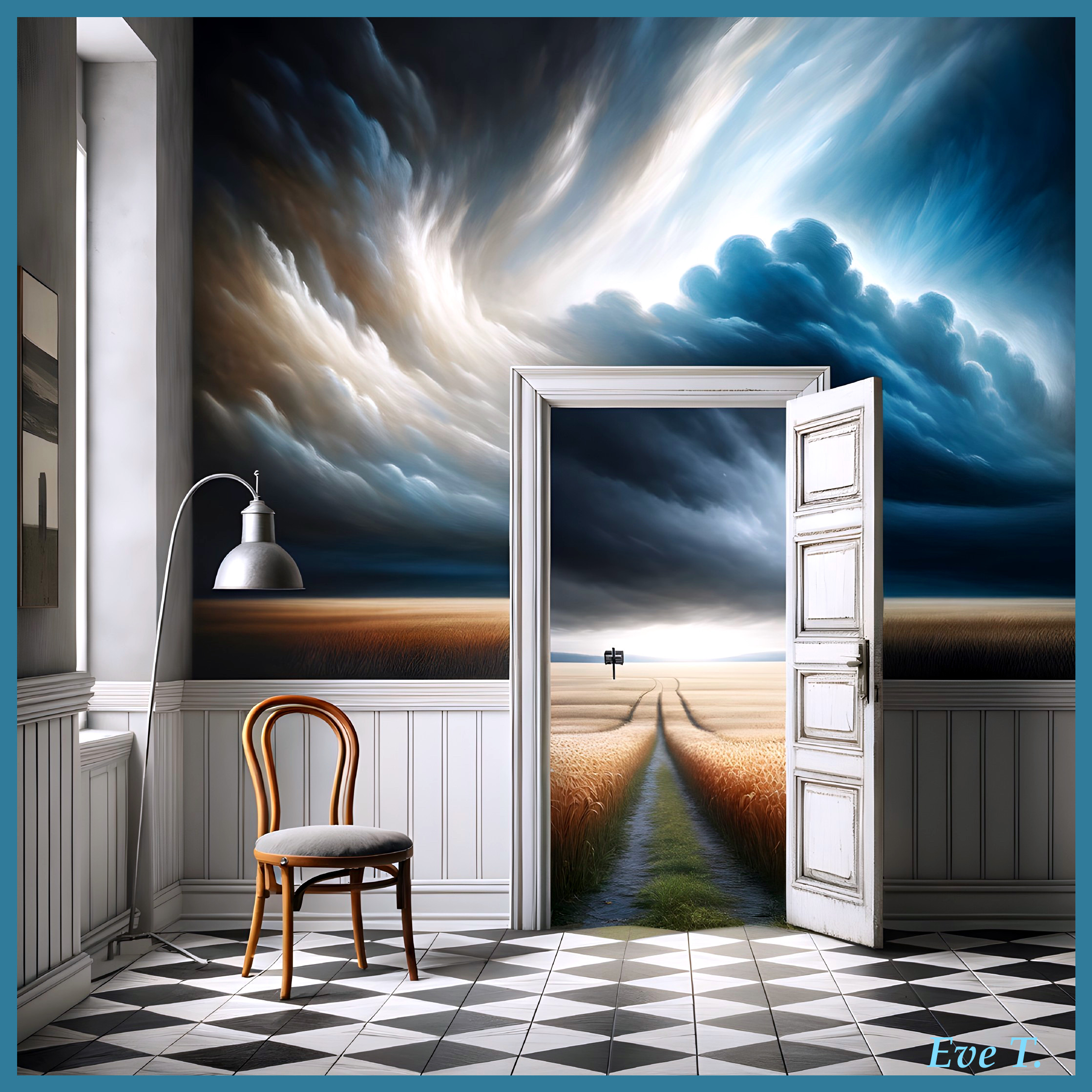 A surreal room opens onto a vast landscape under a dramatic sky, with a path leading to the horizon, blending indoor calm with outdoor intensity.