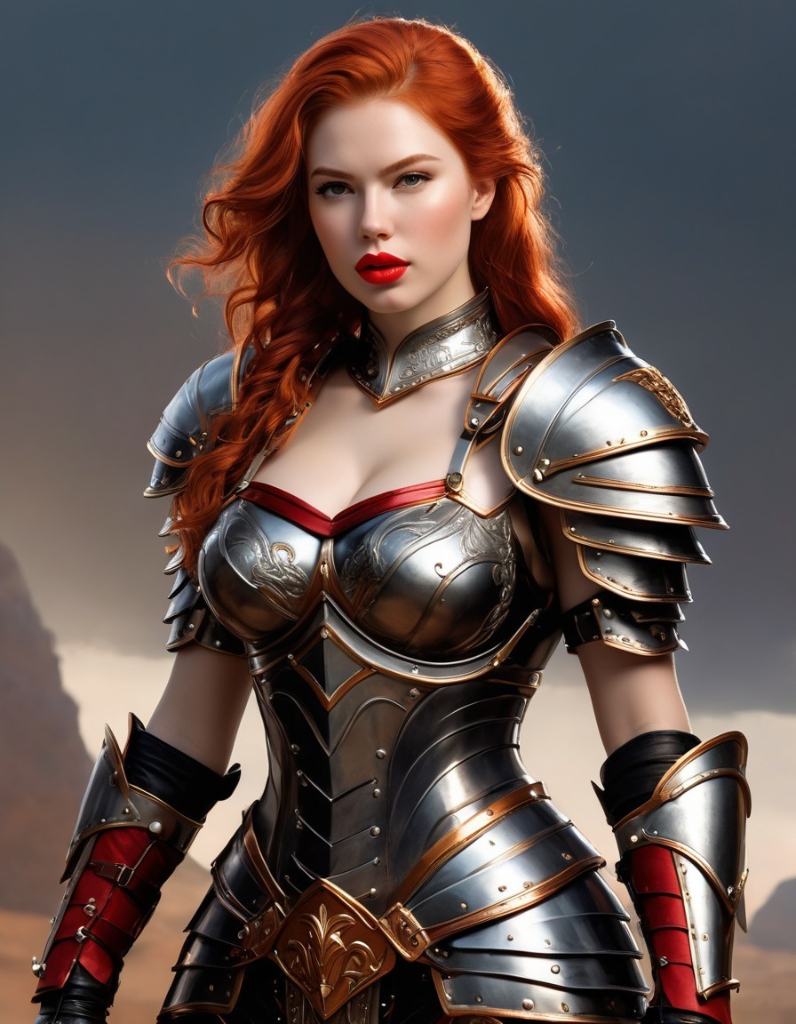 Prompt: attractive and sexy, brutal and cool twenty-five-year-old warrior in armor from the Hyborian Age, red ginger hair, full red lips, full buxom woman, large HH cup breasts, full body view, sword at her hips, digital painting, highly detailed, intricate, intricate pose, clarity, high quality, ultra hd, realistic, vivid colors, highly detailed, UHD drawing, pen and ink, perfect composition, beautiful detailed intricate insanely detailed octane render trending on artstation, 8k artistic photography, photorealistic concept art, soft natural volumetric cinematic perfect light