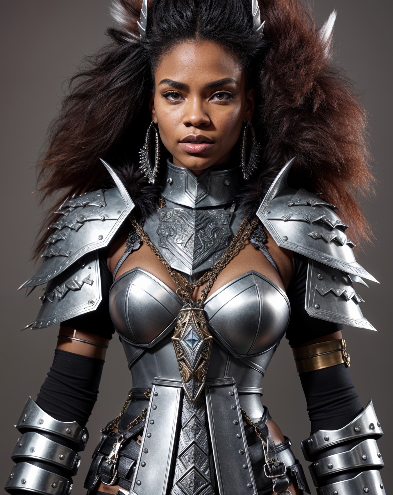 A fierce warrior stands proudly in ornate silver armor, featuring intricate details and a dramatic fur-lined hood. The striking look combines strength and elegance, showcasing a powerful presence.