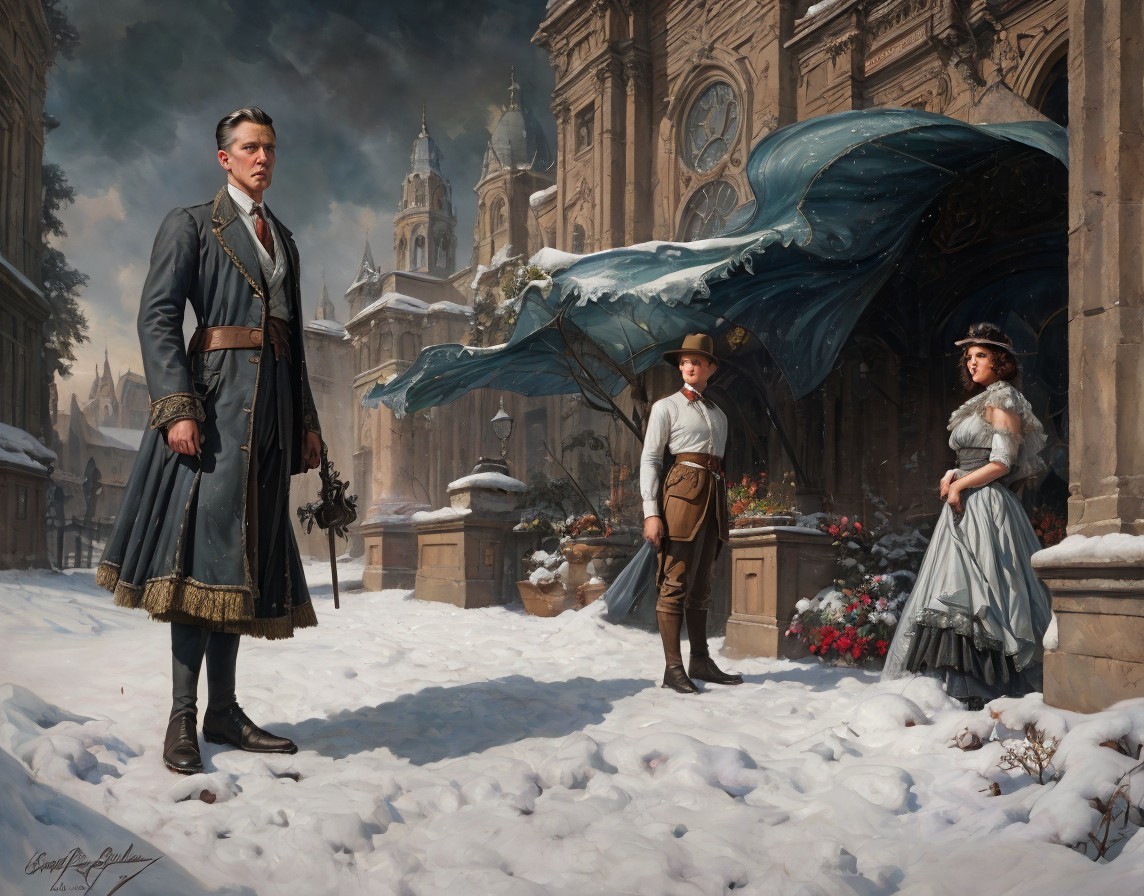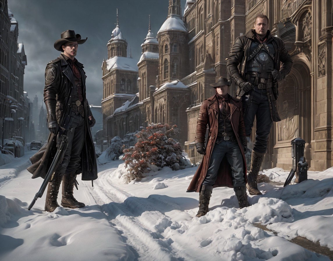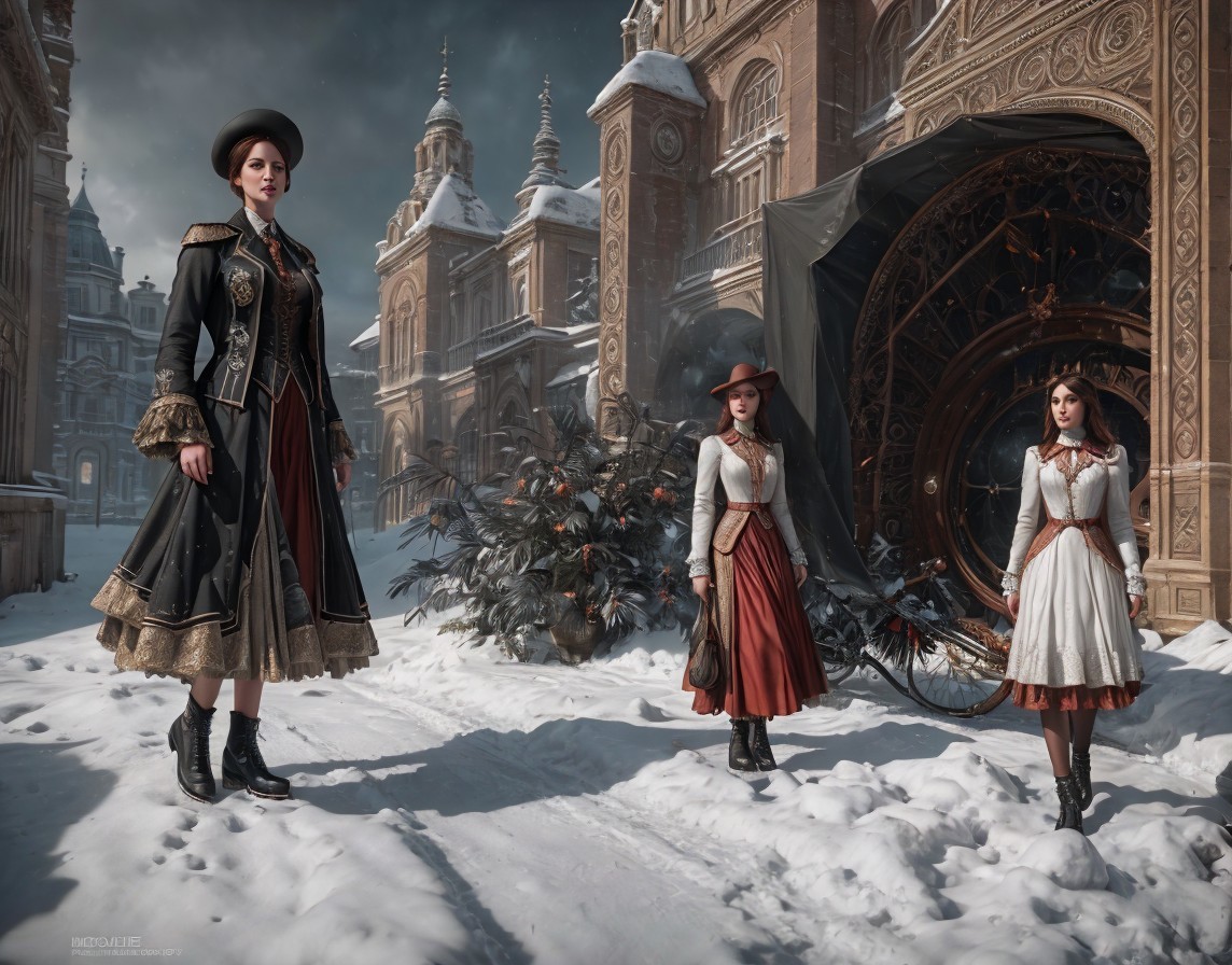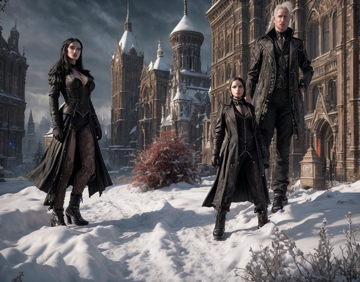 Medieval armor-clad woman in snow-covered street with Gothic buildings.