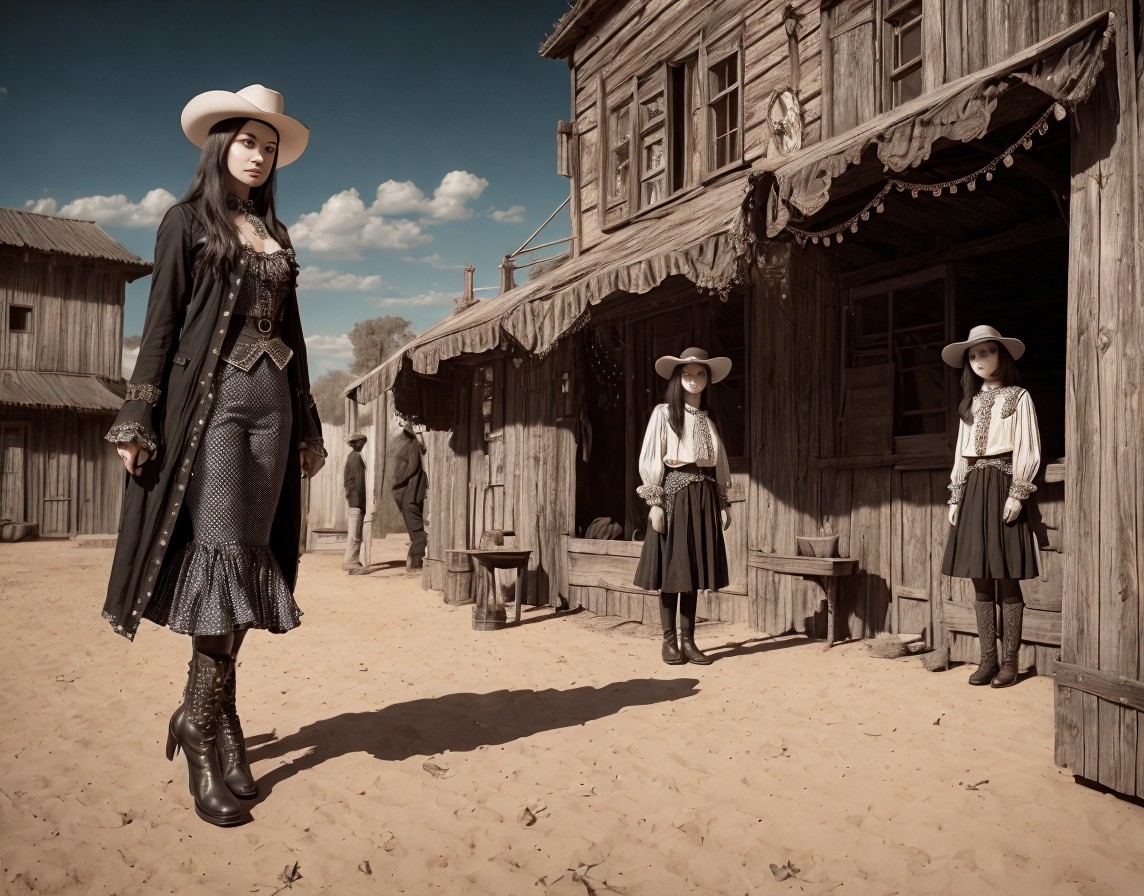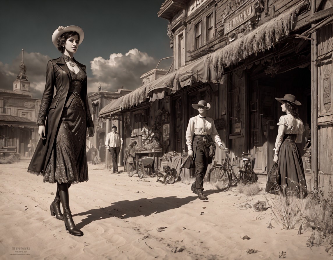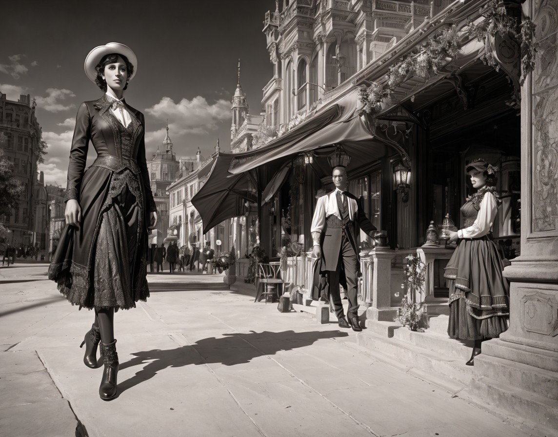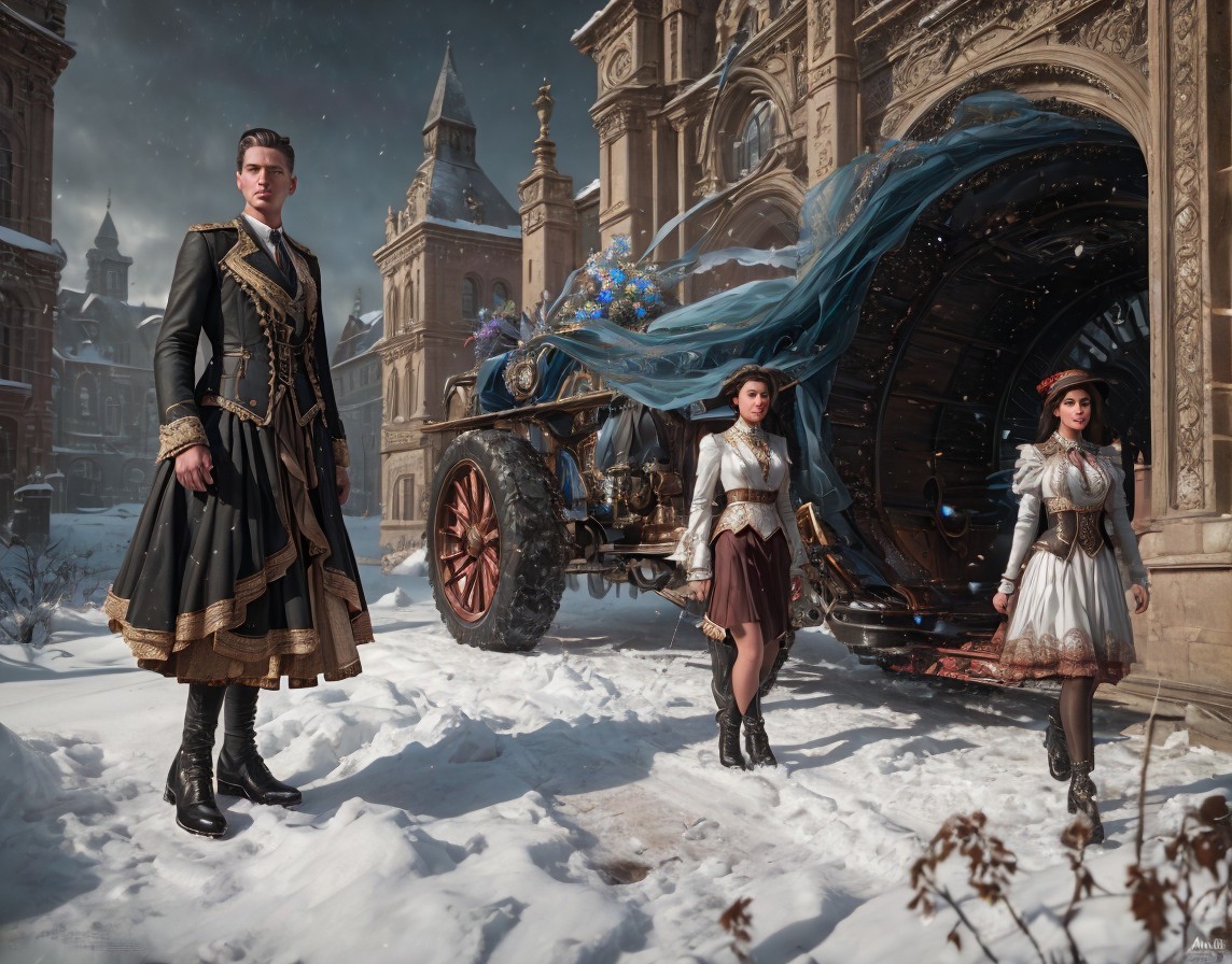 Medieval armor-clad woman in snow-covered street with Gothic buildings.