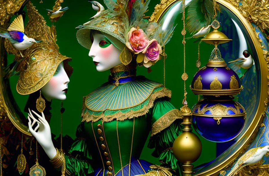 Masked Venetian lady dancing in a glass bell jar filled with taxidermied birds. Venice carnival. Pre-Raphaelite. George Méliès. Harry Clarke. Mucha.