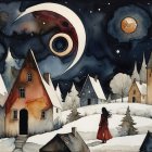 This abstract landscape features dark mountains with geometric patterns, a bright crescent moon, and a shining sun. A solitary tree and stylized evergreens add contrast to the serene winter scene.