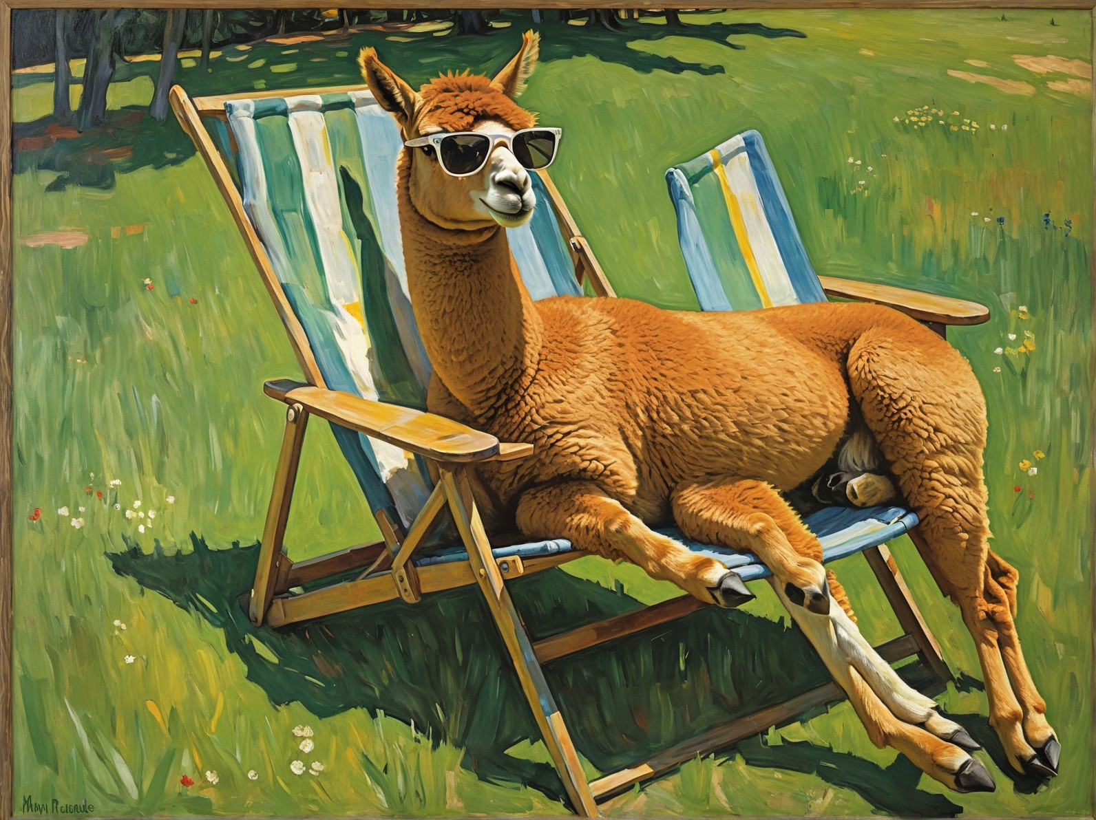 A relaxed lama lounges on a deck chair under the sun, wearing stylish sunglasses. The vibrant colors and smooth brushwork create a whimsical, lighthearted scene.