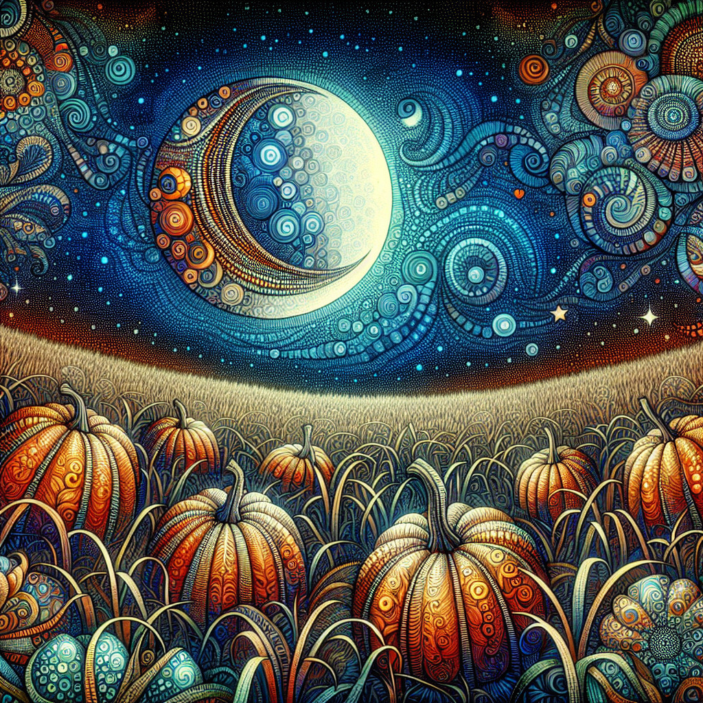 A vibrant autumn landscape features swirling patterns of orange pumpkins amidst a lush green field, under a starry night sky dominated by an ornate crescent moon and twinkling stars.