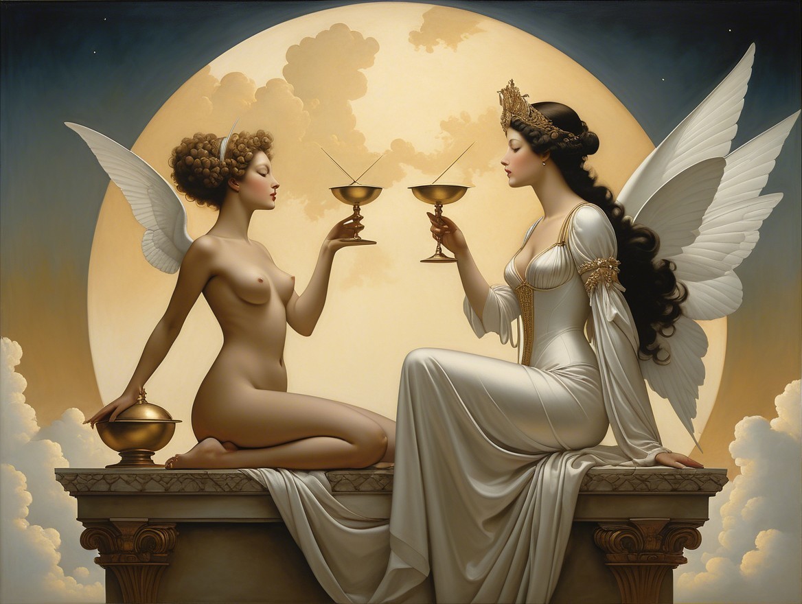 Prompt: "Magical realism fairytale. In the style of John Rogers cox . This artwork amalgamates the artistic styles of Michael Parkes, Lavinia Fontana and Sarah Goodridge, showcasing a harmonious fusion of their respective techniques. The painting exemplifies a seamless integration of parkes magical realism, Fontana's mastery of portraiture and Goodridge's delicate brushwork, resulting in a visually captivating composition that embodies the essence of both artists' unique contributions