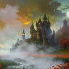 A majestic castle towers amidst ethereal fog and vibrant poppy fields, with a moonlit sky casting a magical glow over the scene. Dramatic clouds enhance the enchanting atmosphere.