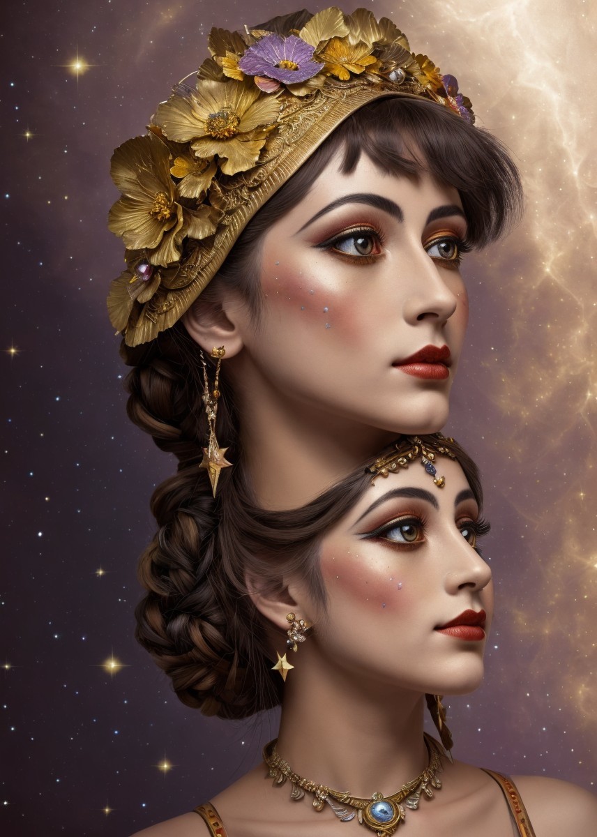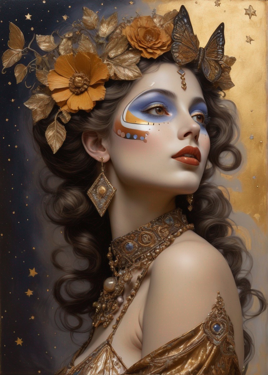 A portrait of a woman with blue skin, golden jewelry, and starry background, adorned with yellow flowers in her hair.