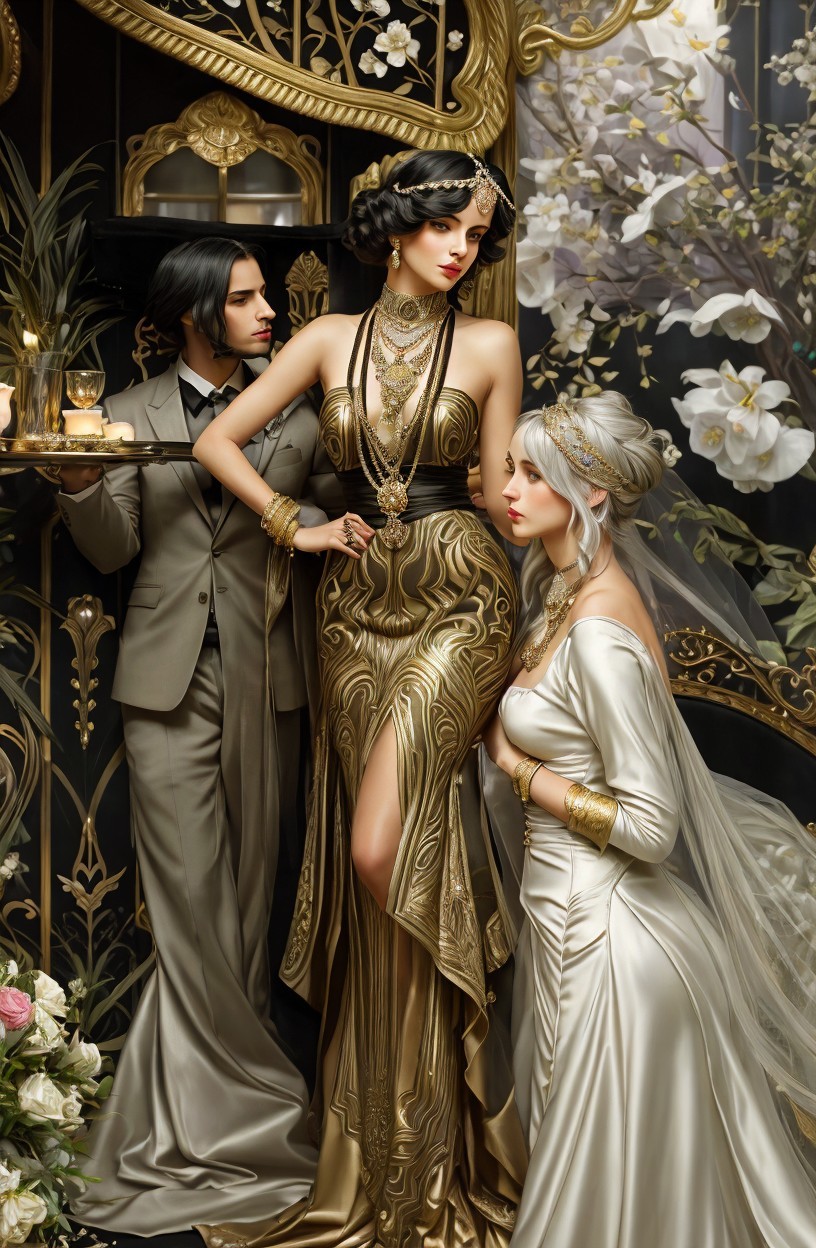 Two elegantly dressed figures in an art deco style setting, with exotic plants and a dusk landscape in the background.