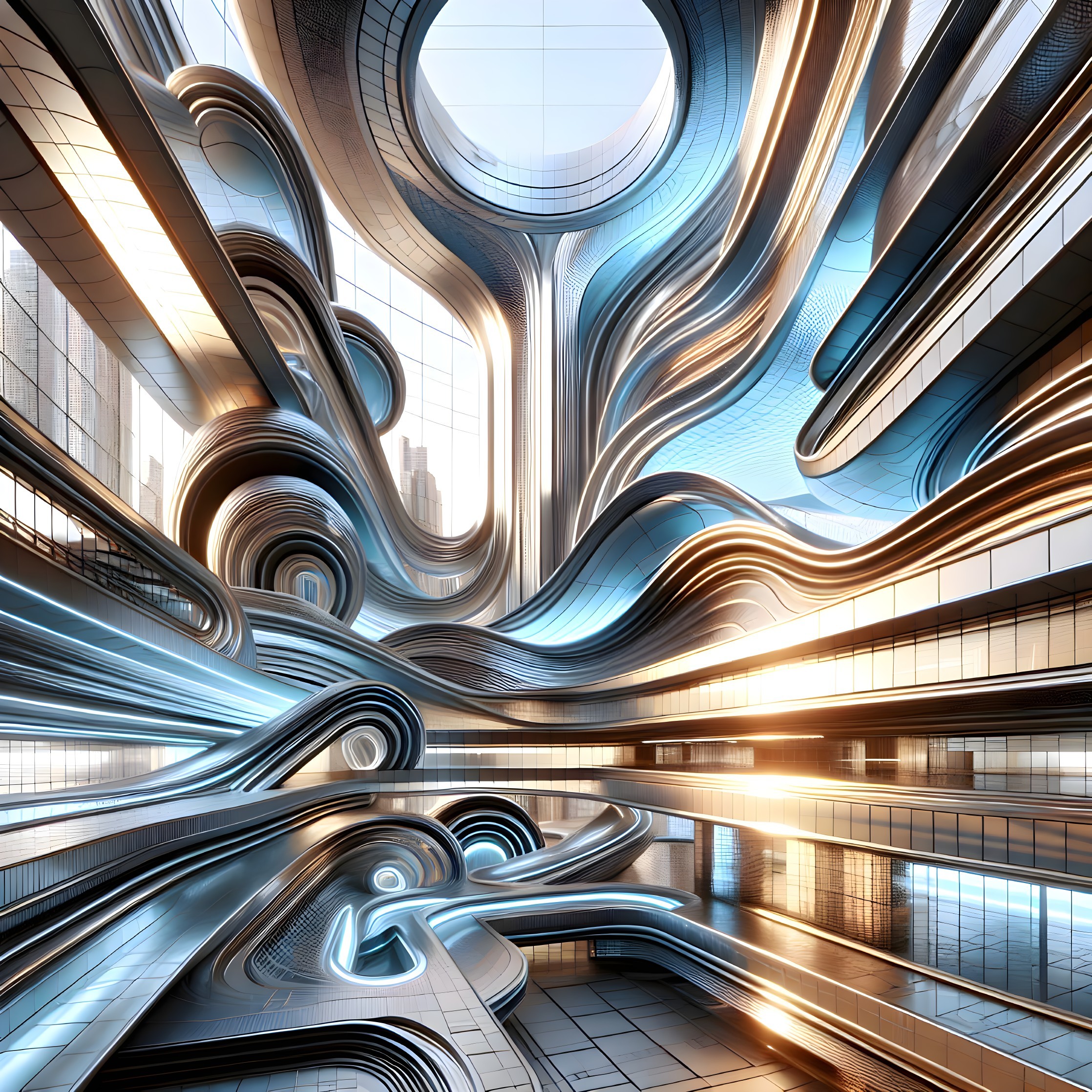 An abstract interior scene featuring fluid, curving metallic structures interwoven with glass elements. The interplay of light creates a dynamic, futuristic atmosphere.