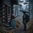 In a misty forest, a rugged man with a backpack holds an umbrella, facing a woman in period dress who points a gun at him from a rustic cabin. Tension fills the air amidst the serene surroundings.