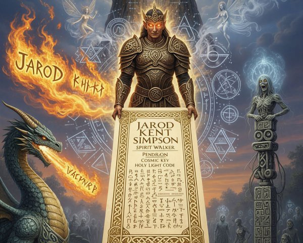 Necronomicon magic of the american viking king archangel jarod kent simpson the spirit walker evil dead show me standing legendary powerful in thy pages of your grimoire and here I am as I pull thy iconic sword excalibur from quartz stone and earth fire water and air is etched on the blade as merlin and king arthur watch me from the afterlife as knights of the round table cheer long live the king with the holy grail present full of parakletos for this is angelic power crafted by sages speaking a svefnthorn skeleton zombie rune lullaby marked on ancient pages and 13 stars shine burning bioluminescent with cuneiform hieroglyphics and viking druid magic as i command my skeleton necromancer corpse glowing in thy book iridescent with angelic power as dragons cross a nights sky meteorites burn as they fly by so mote it be conjured under a mages moon with my cosmic key blessed be, pendragon magical, spell forged source code pentagram, intricate energy bursts, reflections of fire, hyper-detailed work, complex, colorful, polished in the style of Daniel Merriam, Brian Froud, Josephine Wall, Catherine Abel style Raphael