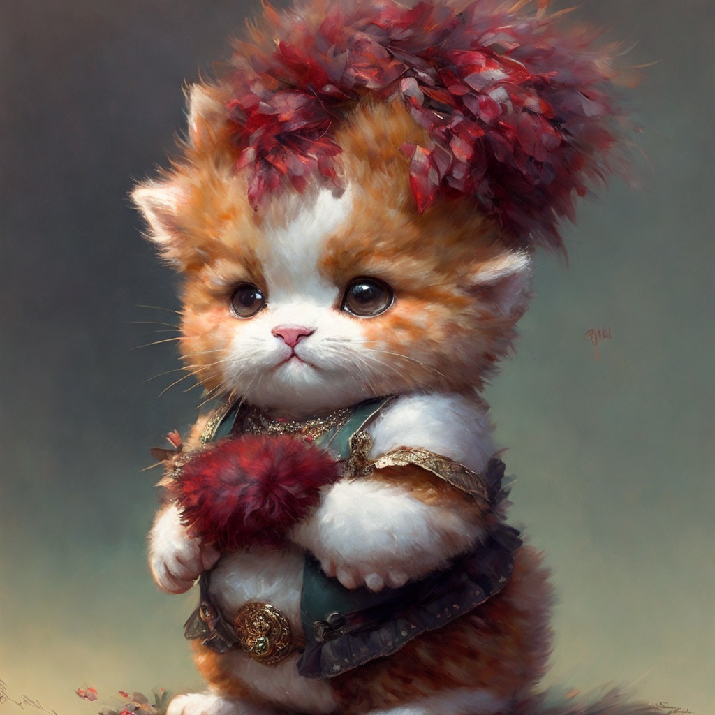 An illustrated kitten with large eyes, extra AI supplied body parts, with decorative adornments, amidst a soft-focus, sparkly background.