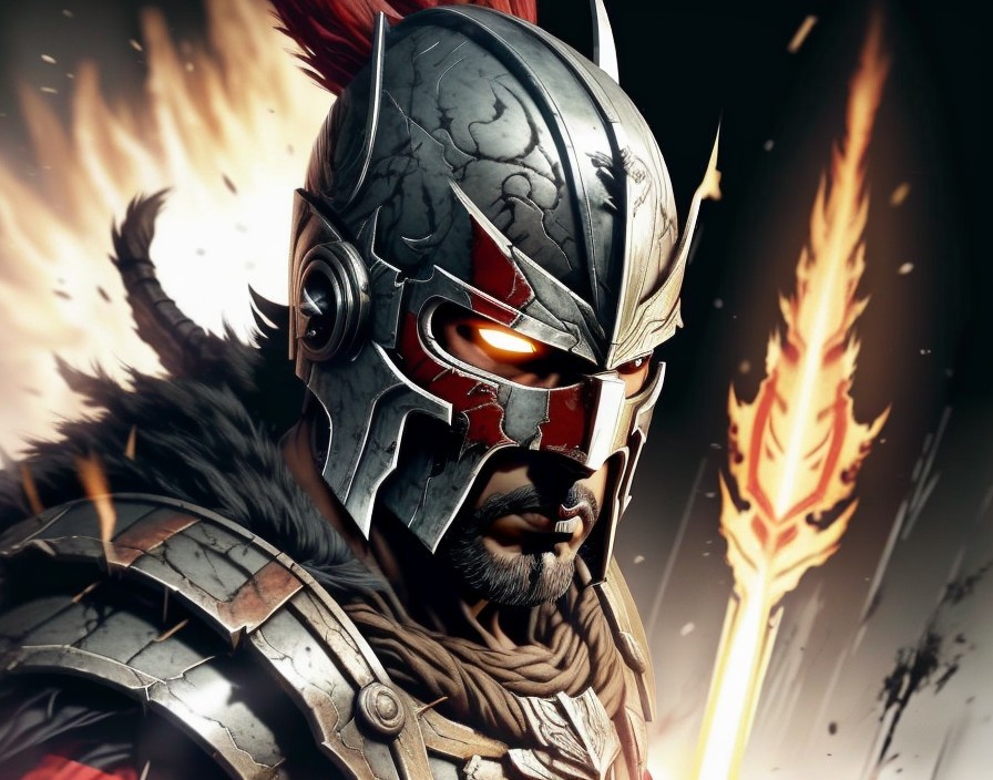 An imposing warrior in ornate red and silver armor, with glowing eyes and a feathered helmet, exudes a fiery aura amidst embers.