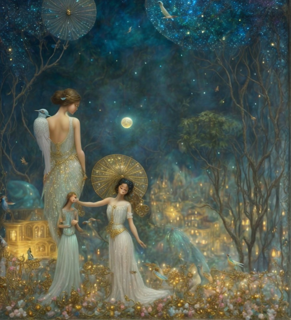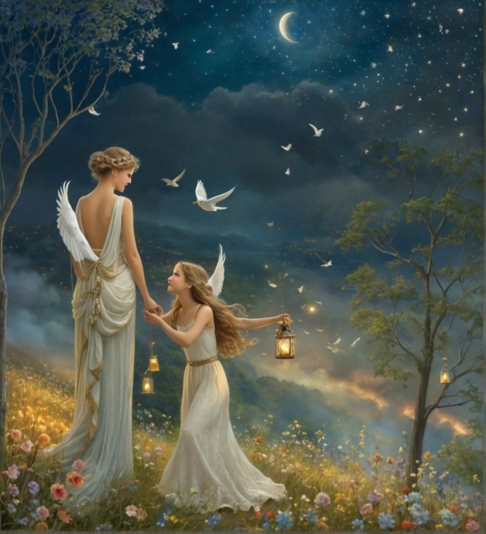 A woman in a flowing white dress holds hands with a young girl in a charming white gown. They stand in a scenic field under a dramatic sky filled with soaring birds and soft, ethereal lighting.