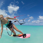 A young woman in a red bikini joyfully kite surfing in turquoise waters, holding her equipment high against a bright blue sky with a few fluffy clouds, capturing a moment of adventure.