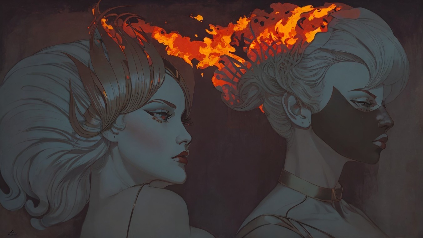Stylized female figures with fiery orange and cool silver hair on dark background
