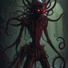 A monstrous creature with a muscular form and sinuous, tentacle-like appendages emerges from darkness. Its skin is a deep red, with a haunting, glowing face, set against a shadowy, cavernous backdrop.
