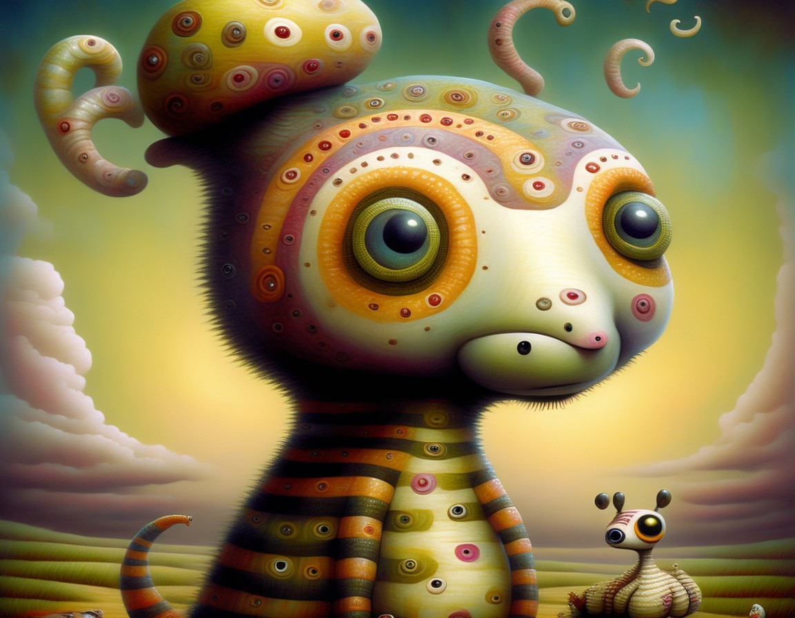 A whimsical, cartoonish creature with large eyes and a round, spiraled body sits in a surreal landscape. Its head has multiple bulbous shapes, surrounded by smaller, curious beings.