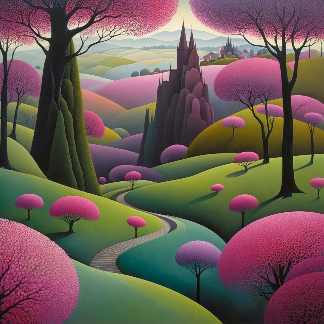 A whimsical landscape features rolling hills adorned with vibrant pink and green trees, leading to a dark castle in the distance. Two figures walk along a winding path through this enchanting scene.