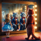 Whimsical Scene of a Girl and Dapper Cats in Mirrors