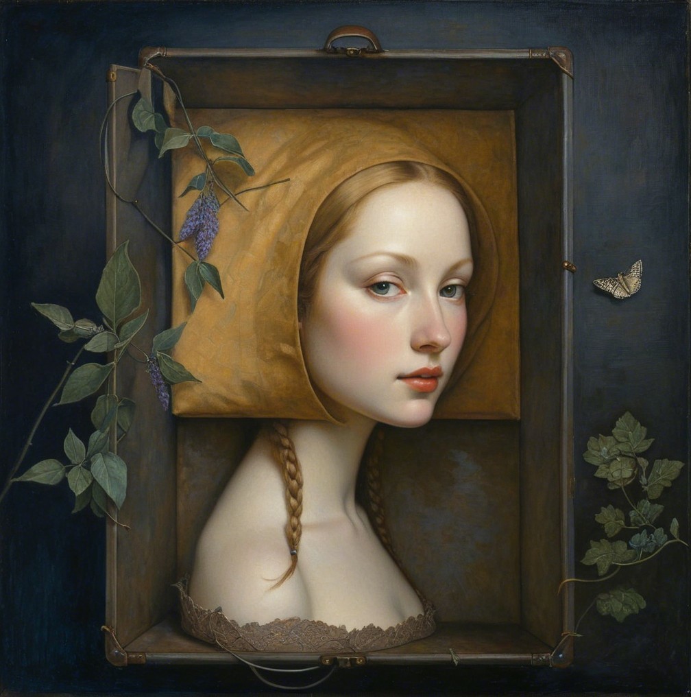 Prompt: I haven't lived life, I haven't lived love. Just bird's eye view from the sky above". Love is a fragile thread, woven through moments. Inside Pandora’s box. This artwork amalgamates the artistic styles of Michael Parkes,