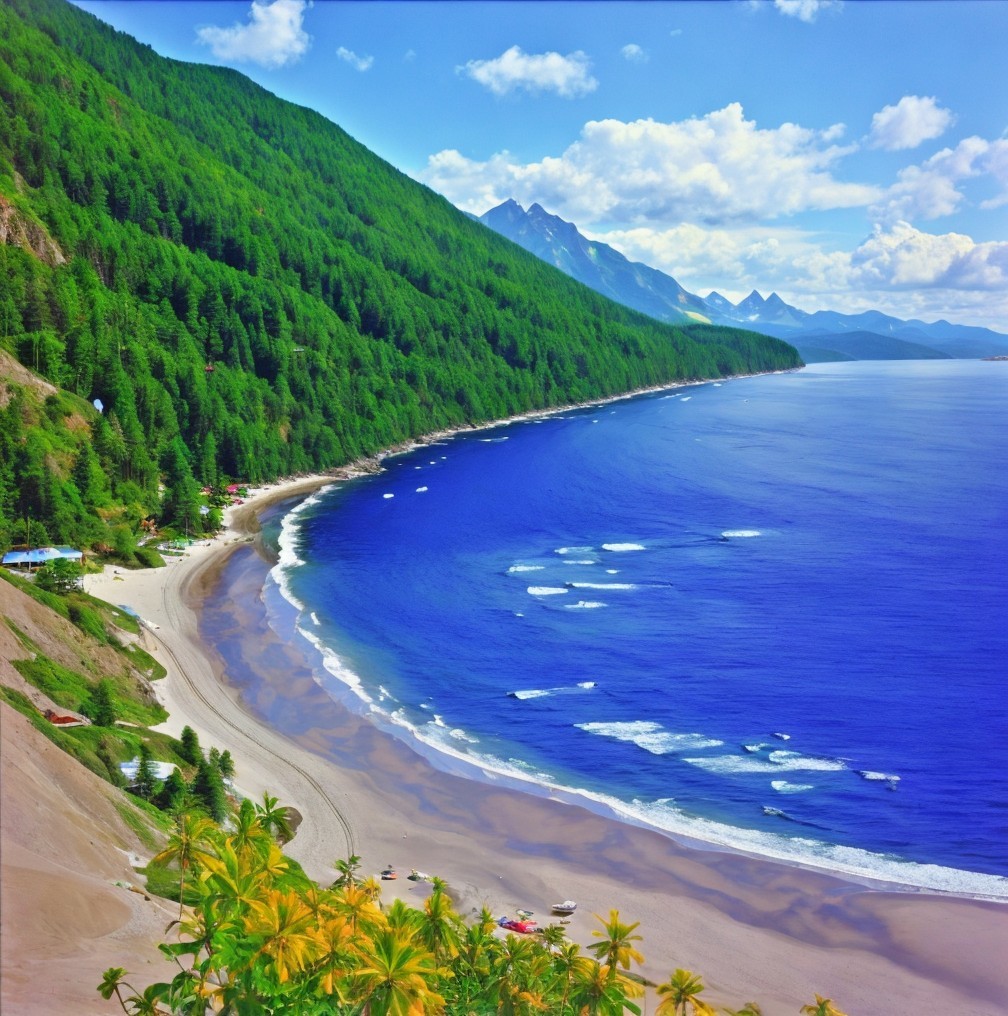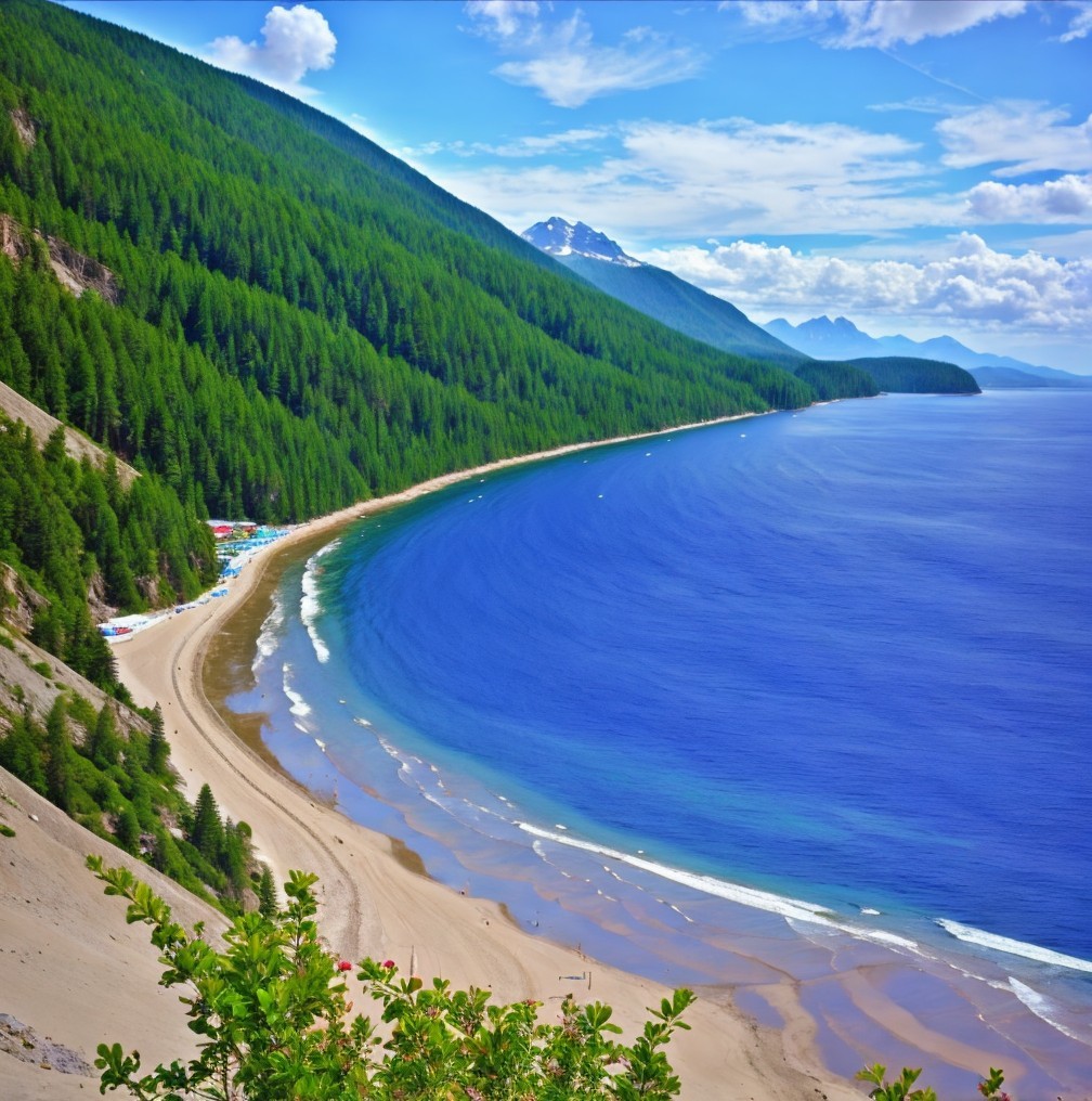 Golden crescent beach nestled among lush green hills under clear blue sky
